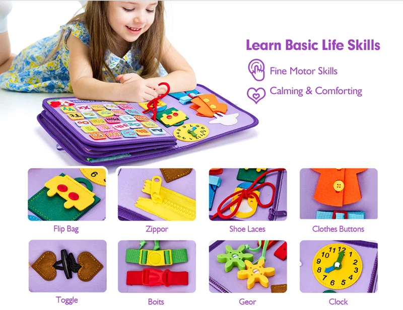 Every detail is crafted with love and purpose. Made from soft, high-quality felt, this board is gentle on tiny hands yet sturdy enough to withstand endless curiosity. Each page is filled with interactive features — zippers, buttons, laces, Velcro, and matching shapes — all designed to develop fine motor skills, hand-eye coordination, and independent problem-solving.